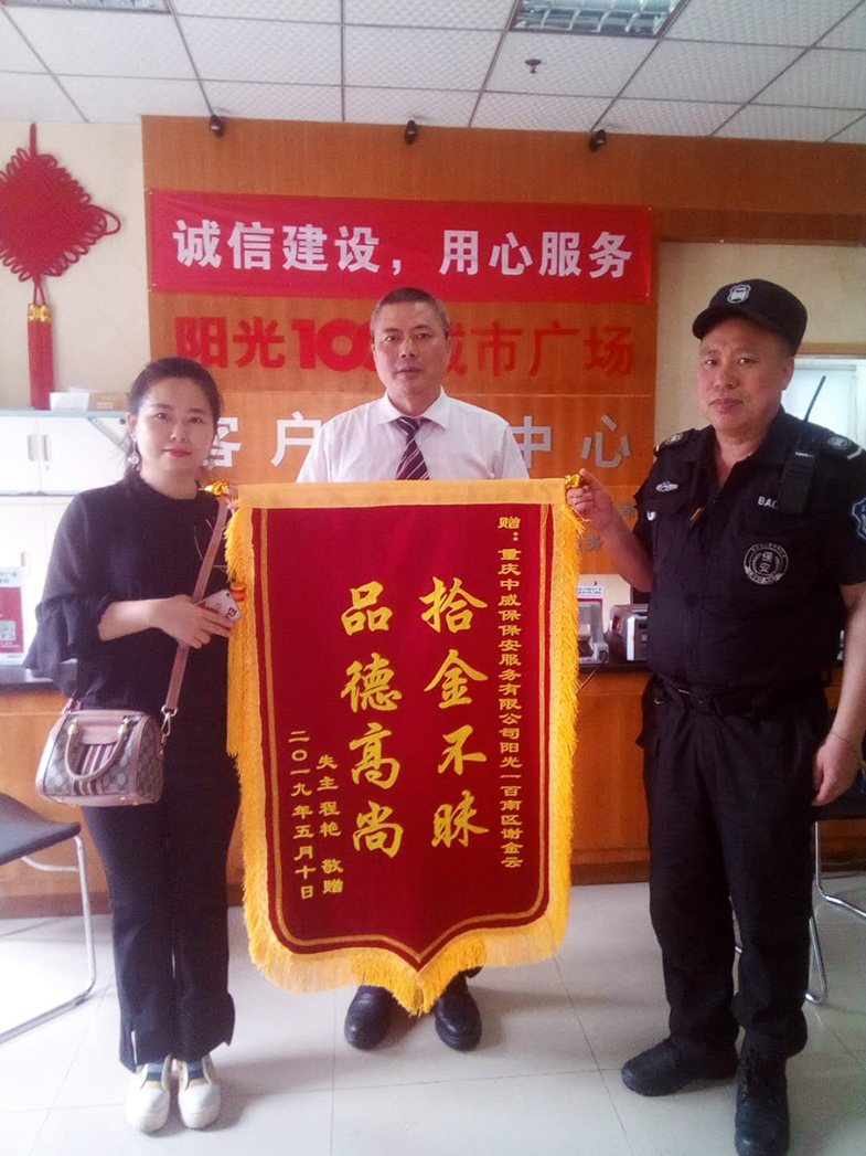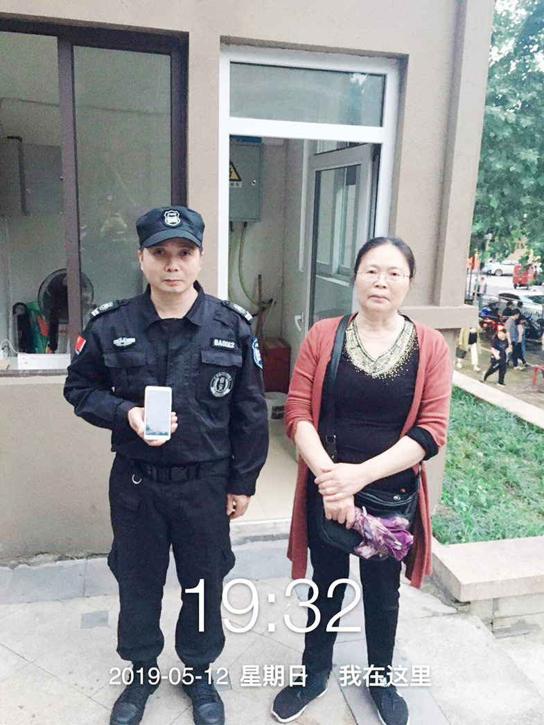 2、2019年5月8日上午11點08分,陽光一百南區(qū)中威戰(zhàn)士謝金云正在執(zhí)勤時,拾到一部蘋果手機,擔心失主著急,謝金云立即上報隊長并詢問R區(qū)廣場上的路人是否有人遺失了東西,正在謝金云詢問的過程中,他接到了失主程女士用其他手機撥過來的電話,謝金云這顆為失主焦慮不安的心才得以放下。謝金云告訴失主程女士讓她前往陽光一百南區(qū)客服中心領(lǐng)取手機,程女士連聲感謝。