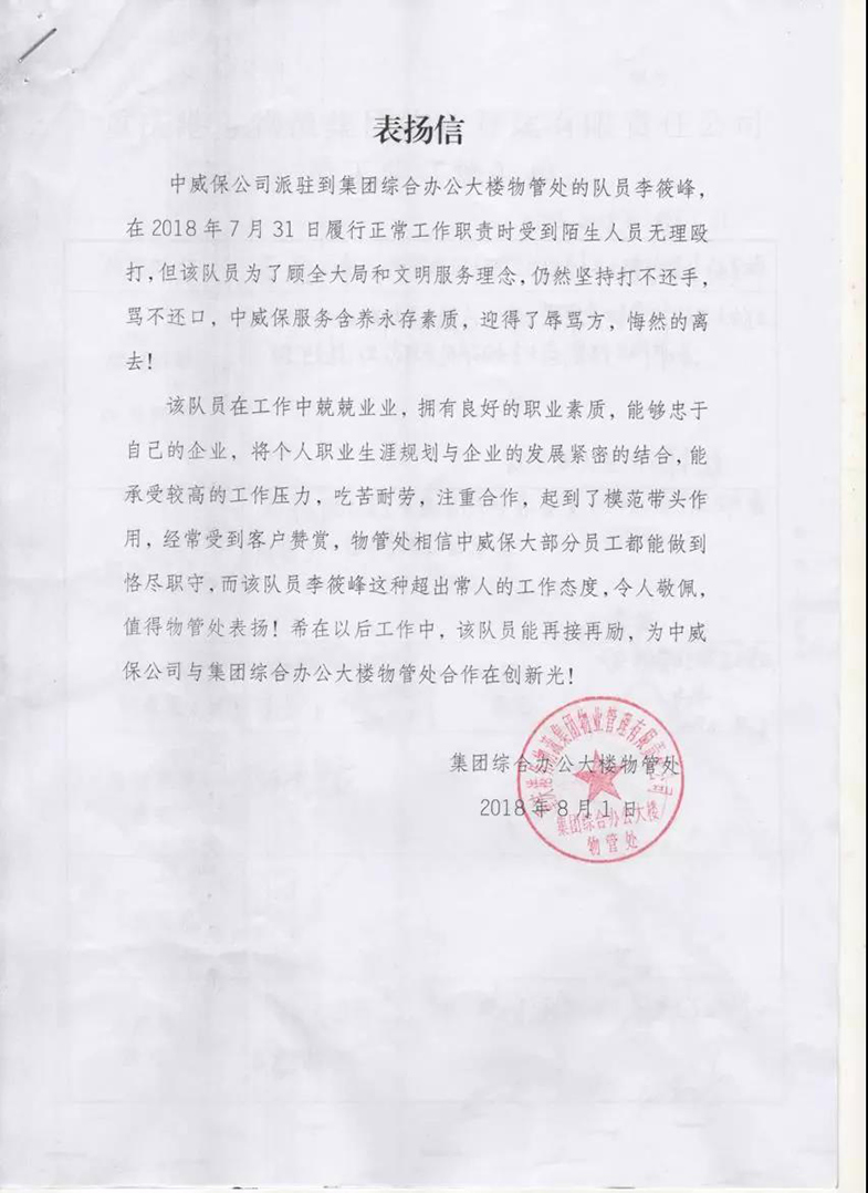 2018年7月31日晚上,我司港務(wù)大樓隊(duì)員李筱峰在履行正常工作時(shí)受到陌生人員無(wú)理毆打,但該隊(duì)員為了顧全大局,仍然堅(jiān)持文明執(zhí)勤,李筱峰的工作態(tài)度令人敬佩,為了表示鼓勵(lì),重慶港務(wù)物流集團(tuán)特通報(bào)表?yè)P(yáng),希望在以后工作中,該隊(duì)員能再接再勵(lì),為中威保與港務(wù)集團(tuán)的合作再創(chuàng)新光!