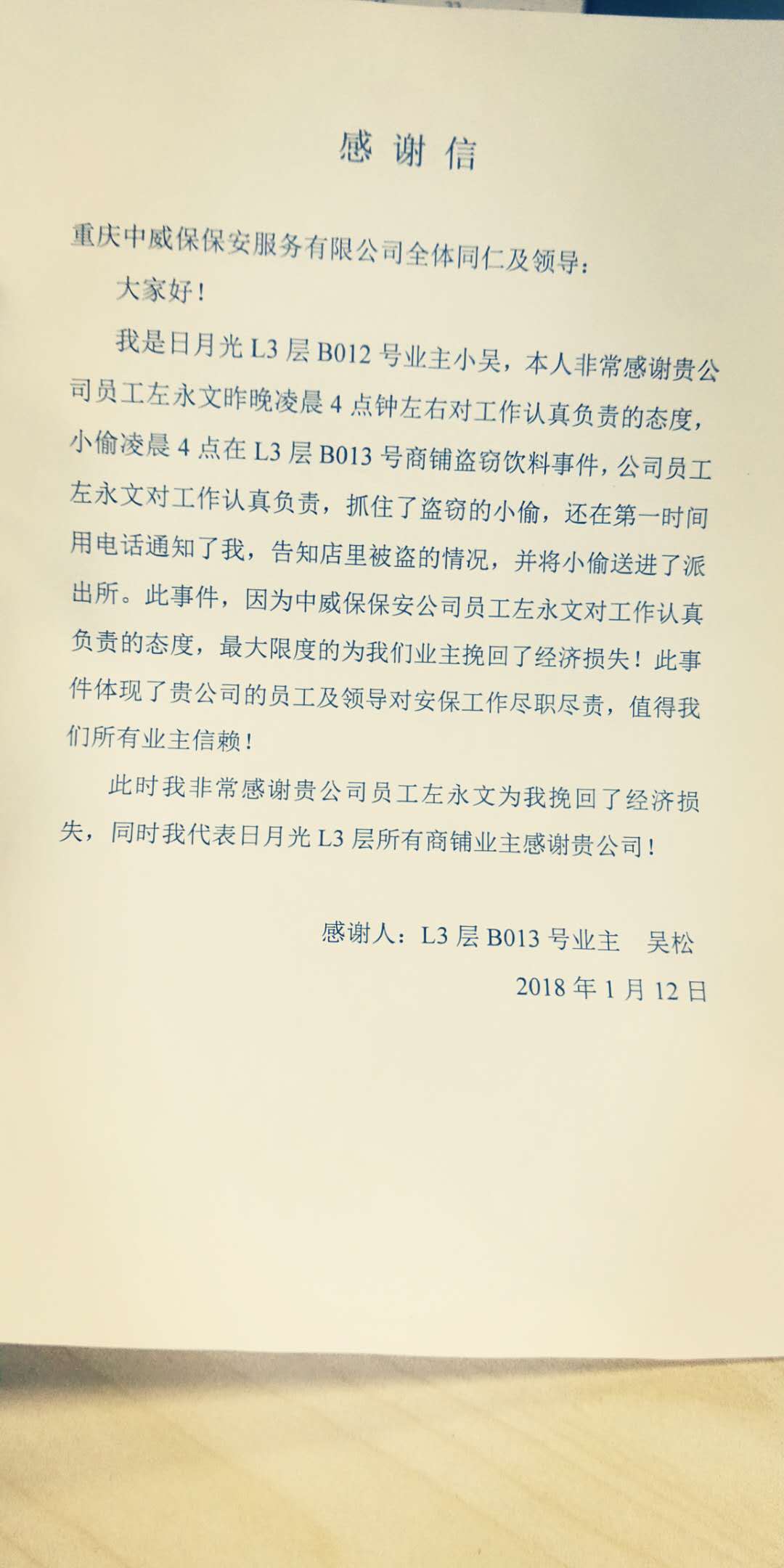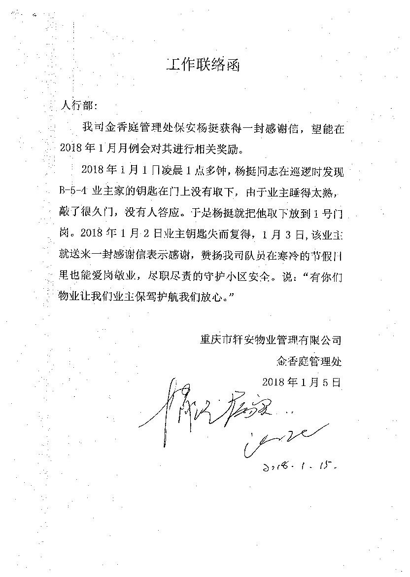 日月光保安認(rèn)真負(fù)責(zé)獲表揚信